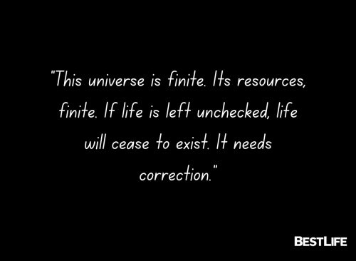 “This universe is finite. Its resources, finite. If life is left unchecked, life will cease to exist. It needs correction.”