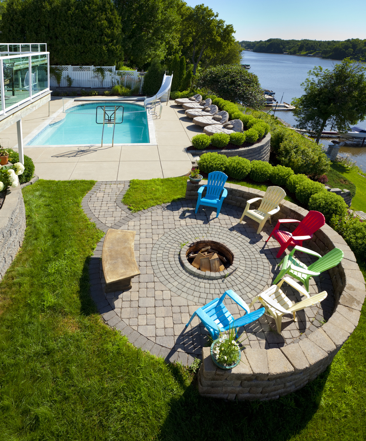 Fire pits are meant to be whimsical, so Alex Barrates , contractor and founder of Alex Painting , suggests decorating with colorful Adirondack chairs. String lights make it even prettier after dusk.